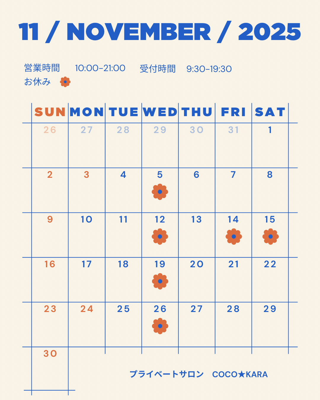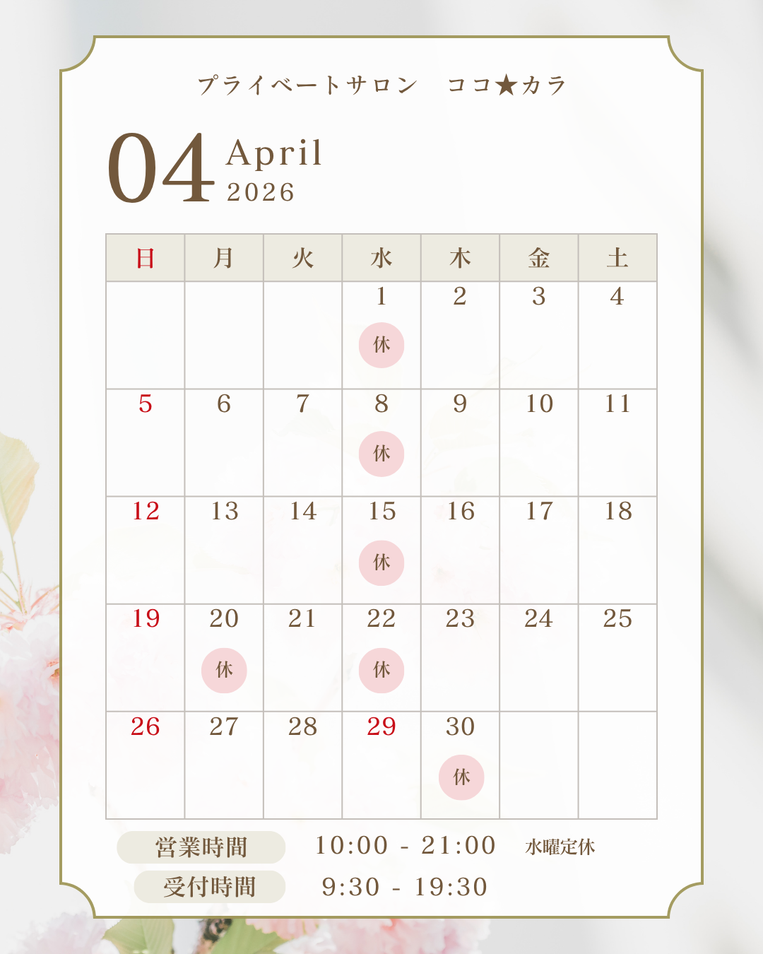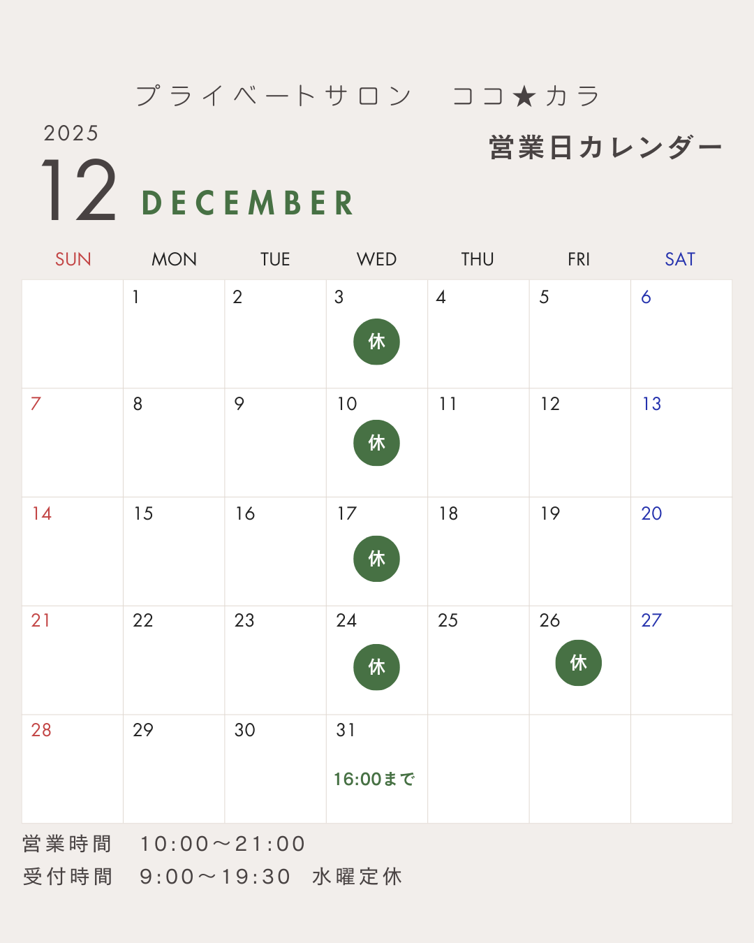| 営業時間 | 10:00~21:00 【予約受付時間は9:30~19:30】 水曜定休(臨時休業有り) |